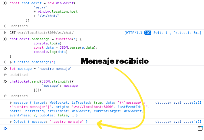 Ready, we can now send websocket messages to django and receive a response. But so far what we have done is a fairly simple interactive application that sends and returns text using the ws protocol, what if we want to take full advantage of channels to create applications where many users interact? In the next post I will talk about the channel layer and the channel groups.