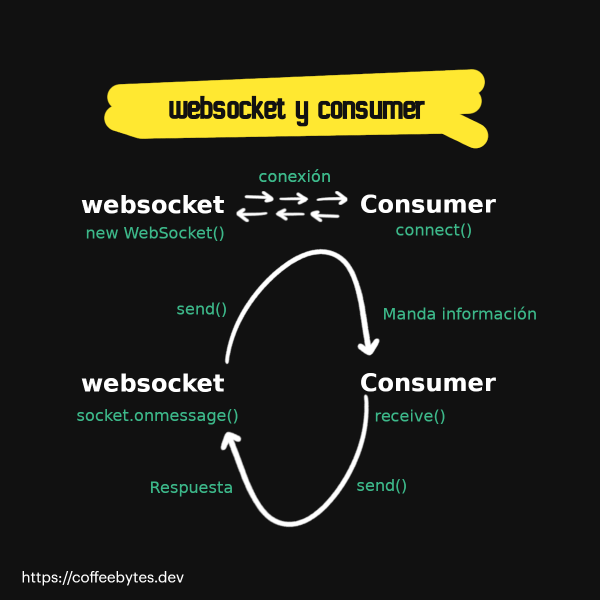 The web socket sends information with the send method, the consumer receives it with its receive method, and then sends a response with send, which the websocket will process with onmessage.