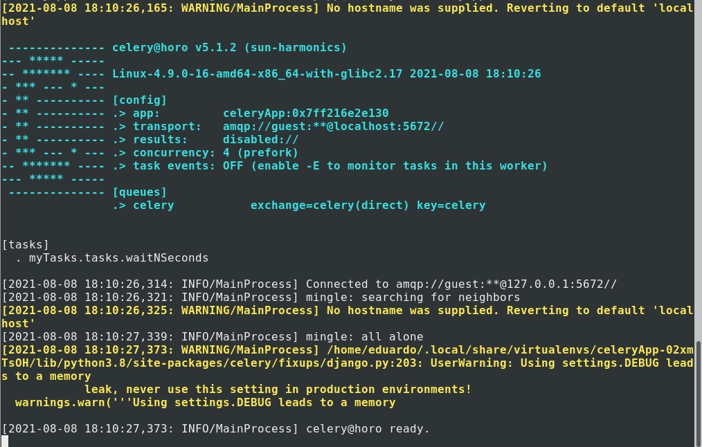 If we now run celery we will see that it runs and connects to RabbitMQ