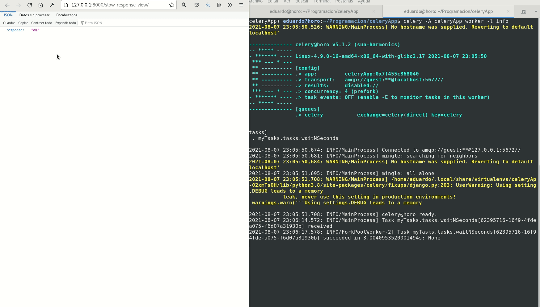 If we now access the view we just created, we will see that it returns the JSON response immediately, without waiting the 3 seconds. While in the terminal appear the messages of the task that is being processed by Celery