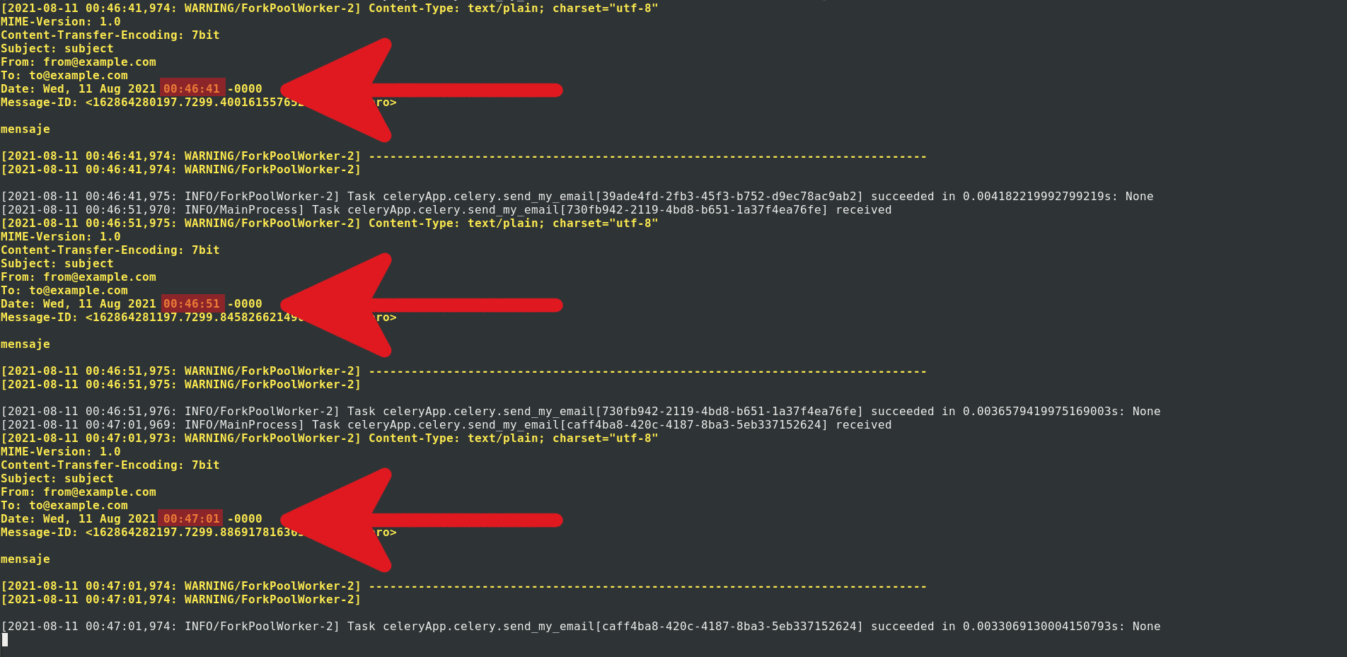 sender.add_periodic_task(10.0, send_my_email.s('subject', 'message', '[email protected]', ['[email protected]']), name='Envia email cada 10 segundos')