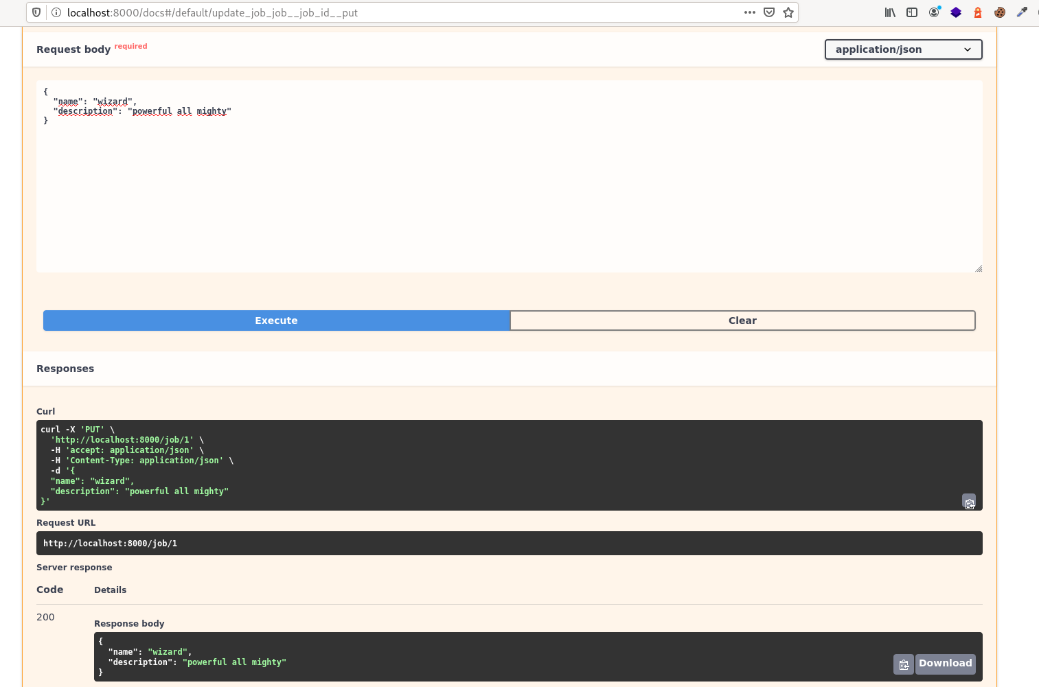 If we now make a web request using the documentation interface that fastAPI creates, in /docs/, we will see that we will be able to create a Job object using a name and a description.