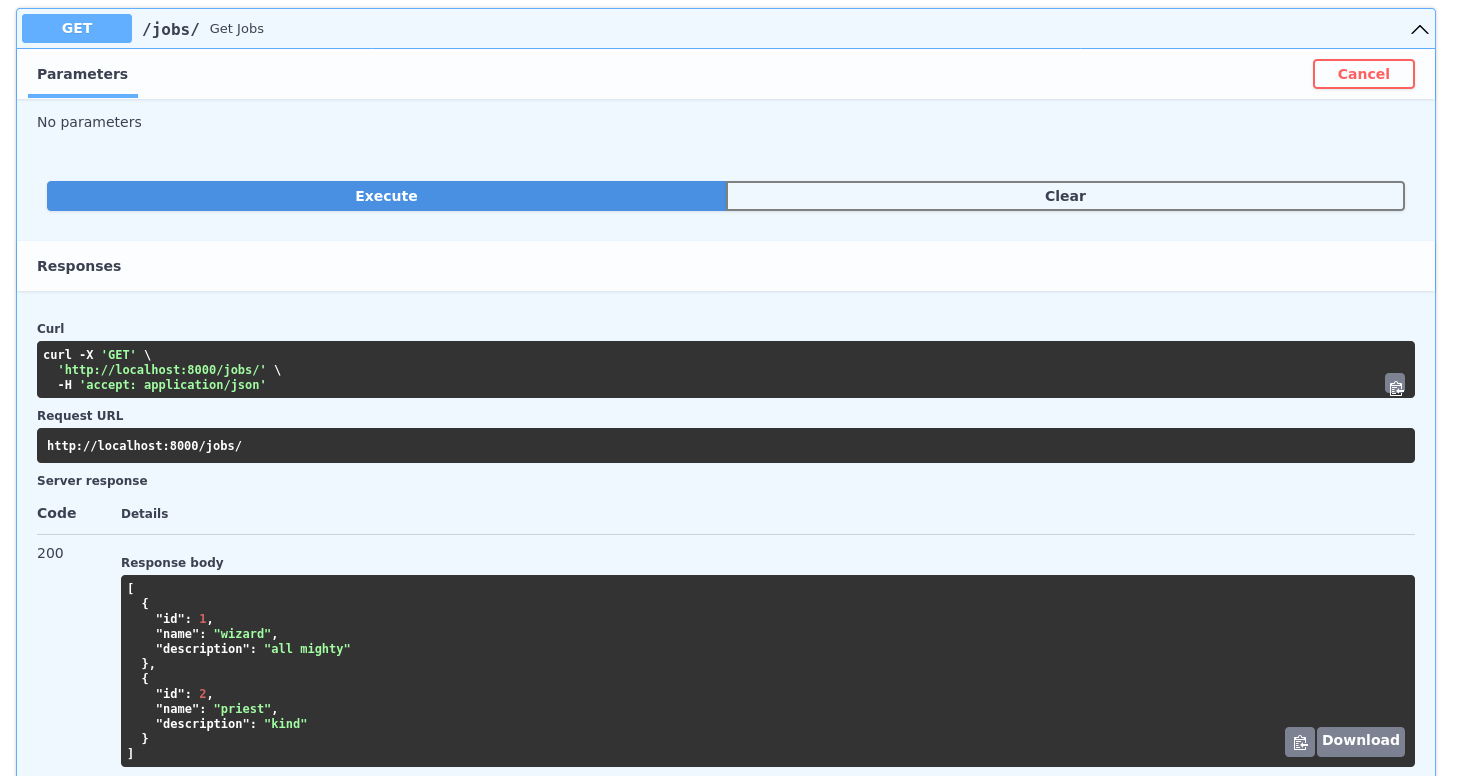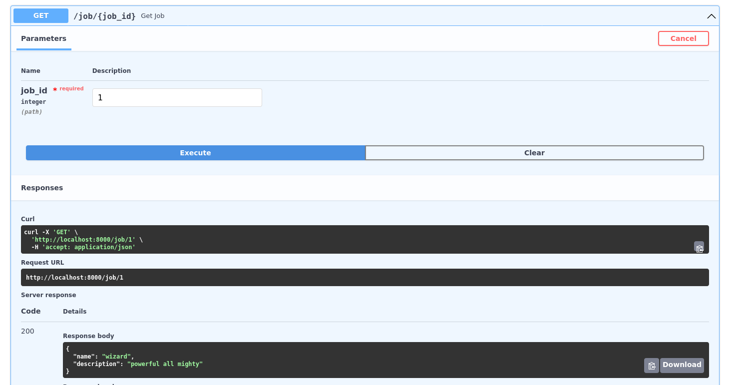 Now we can apply the same method as in the previous section. This time we will need an id and the fastAPI’s get() method. We pass it the response_model to take care of the validation and define that the only parameter we will use will be the id, with which we will use the from_queryset_single() method on the result of the ORM query: Job.ge_t(id=job_id)_.