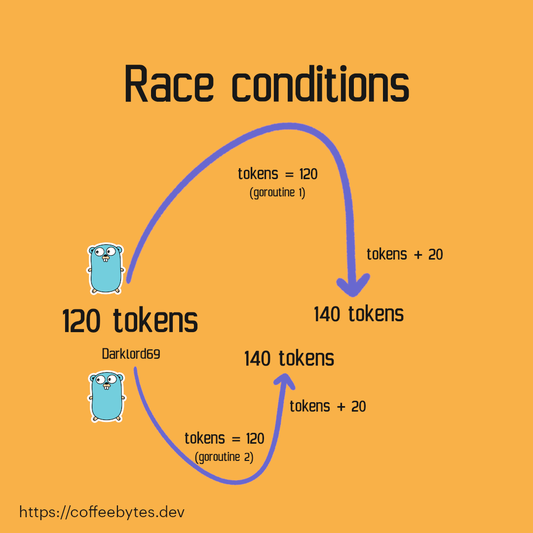 The important part is that, within a goroutine, we read the variable content tokens, then increment it by 20 and then assign that result to tokens again. But no problem, if we run the code we will get the correct result: 320 (120 tokens + One increment of 20 tokens for each of the 10 goroutines).