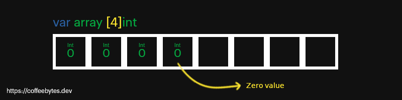 In the above example, we have an array with space for 4 integers. The values that we do not assign will be assigned as zero values.