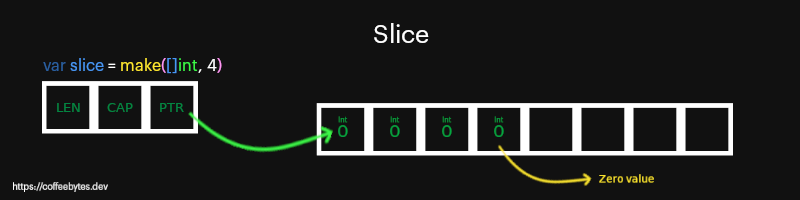 Internally a slice is a struct with a pointer to the real array. In addition to the pointer, it has a property called cap and len, which refer to the capacity and length of the array, respectively.