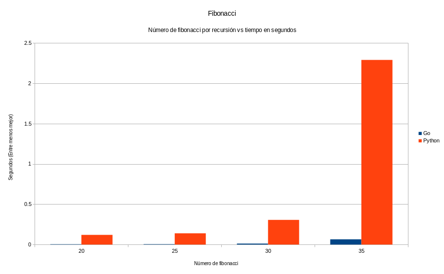 How fast is go compared to python? I made a small test using multitime to measure how long it takes to calculate the n fibonacci number for each language, 10 repetitions for each test, results are in seconds (smaller is better), note the radical difference in performance of both languages.