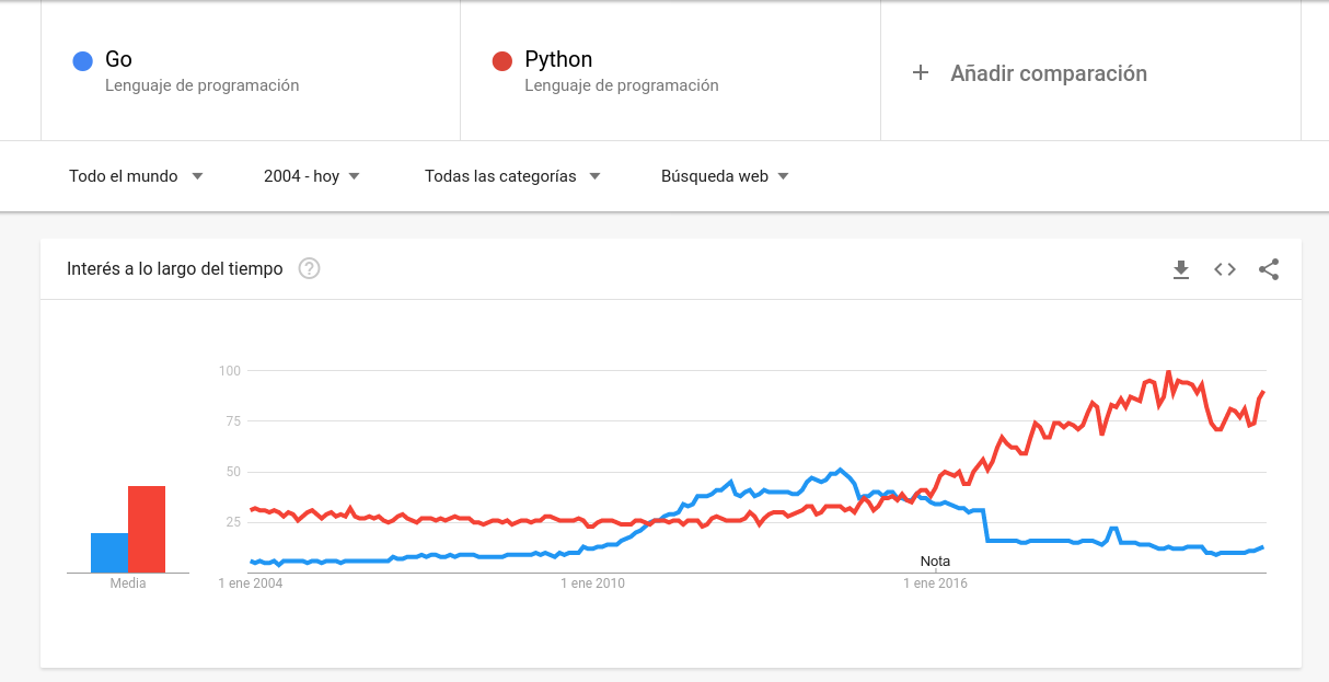 To date Python is much more popular than Go. You can see that Go gained popularity between the period between 2011 and 2015, but stabilized to fall below Python.