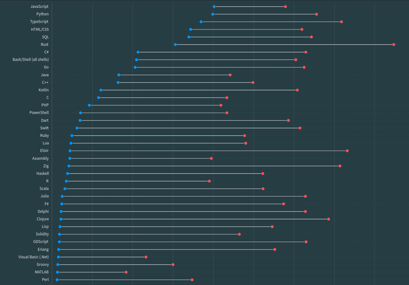 Popularity | Growing, loved by devs (higher salaries) | More popular overall, dominant in AI/data science |