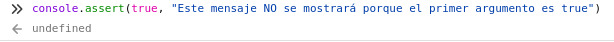 console.assert(true, "Este mensaje NO se mostrará porque el primer argumento es true")