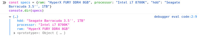 const specs = {ram: "HyperX FURY DDR4 8GB", processor: "Intel i7 8700K", "hdd": "Seagate Barracuda 3.5'', 1TB"}