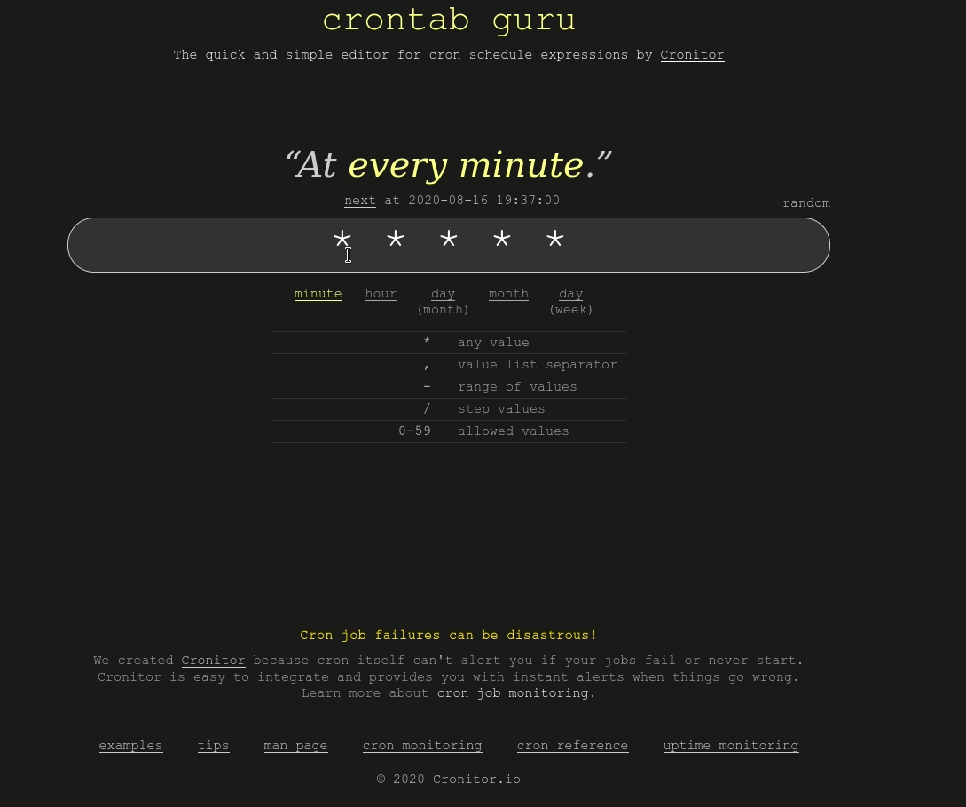 To avoid annoyances there is a useful tool called crontab.guru . This tool will take care of translating your configuration into simple, easy to understand English. If you have doubts about whether the configuration you just typed is really the right one, you can type it into the web page and it will show you the result in English.