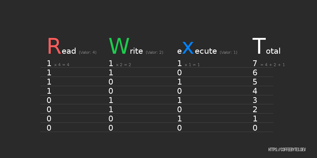 Considering the above, a value of 7 (4+2+1) means that it has full permissions, a value of 5 (4+1) means that it has read (r) and execute (x) permissions, a value of 3 (2+1) means write (w) and execute (x) permissions for a file.