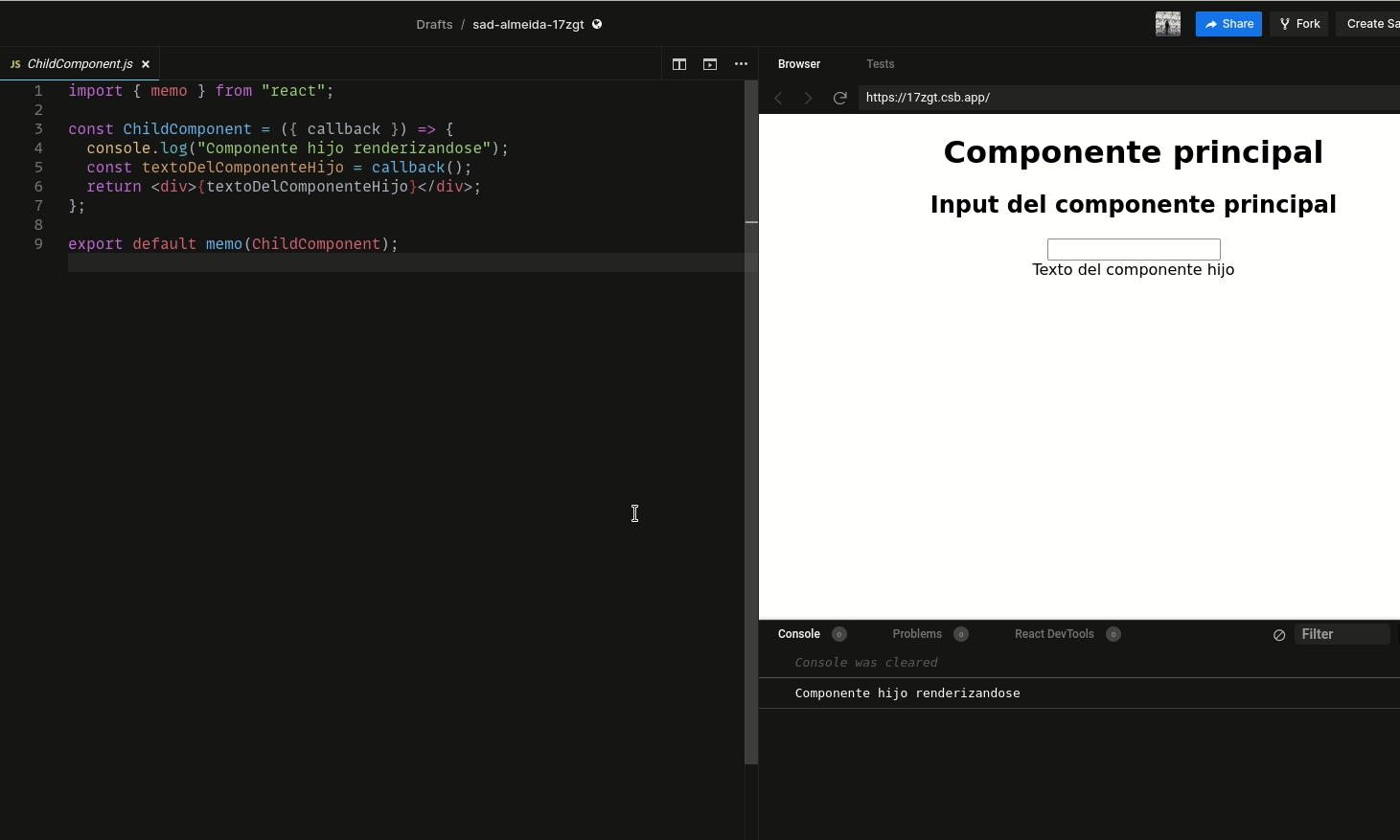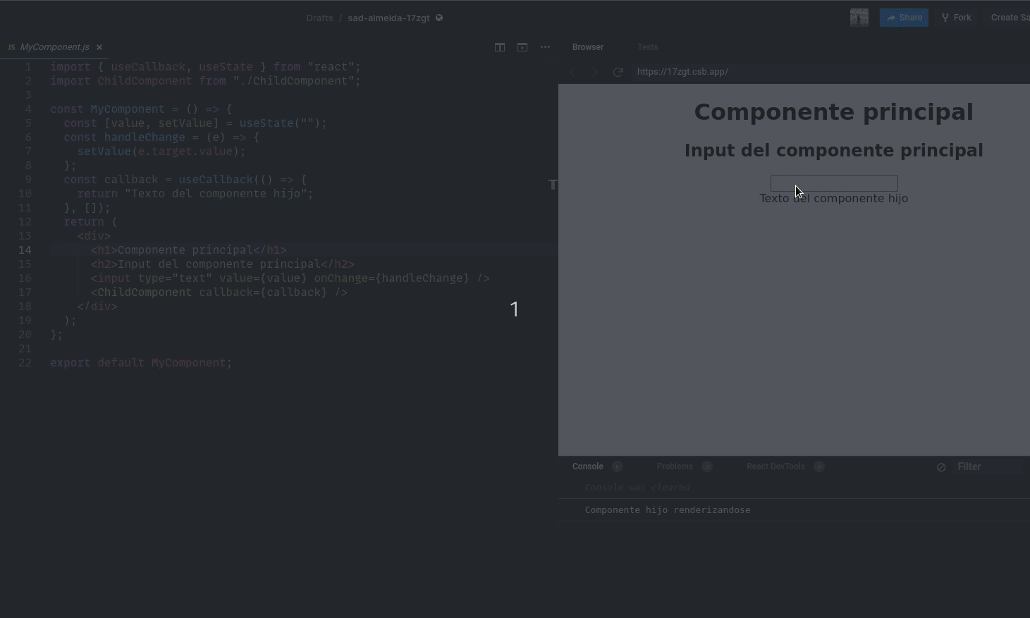 Why? First, we are using memo in the ChildComponent to avoid renderings. Second, we are using useCallback to prevent the MyComponent function from changing, so memo always receives the same prop.