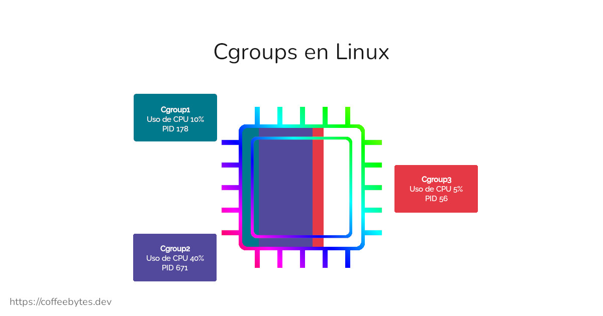 Los cgroups, o grupos de control que nos provee el kernel de linux, nos permite organizar nuestros procesos en grupos, y limitar los recursos de CPU, memoria, entrada, salida, el número de procesos y los paquetes de red que genera cada uno de estos grupos.