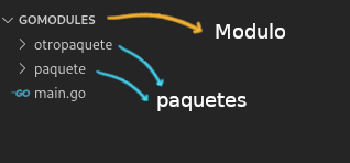 Por ejemplo, si le pasamos como nombre mimodulo, todas las carpetas que estén al mismo nivel que el archivo go.mod y que declaren un package al inicio de su archivo, se considerarán paquetes.