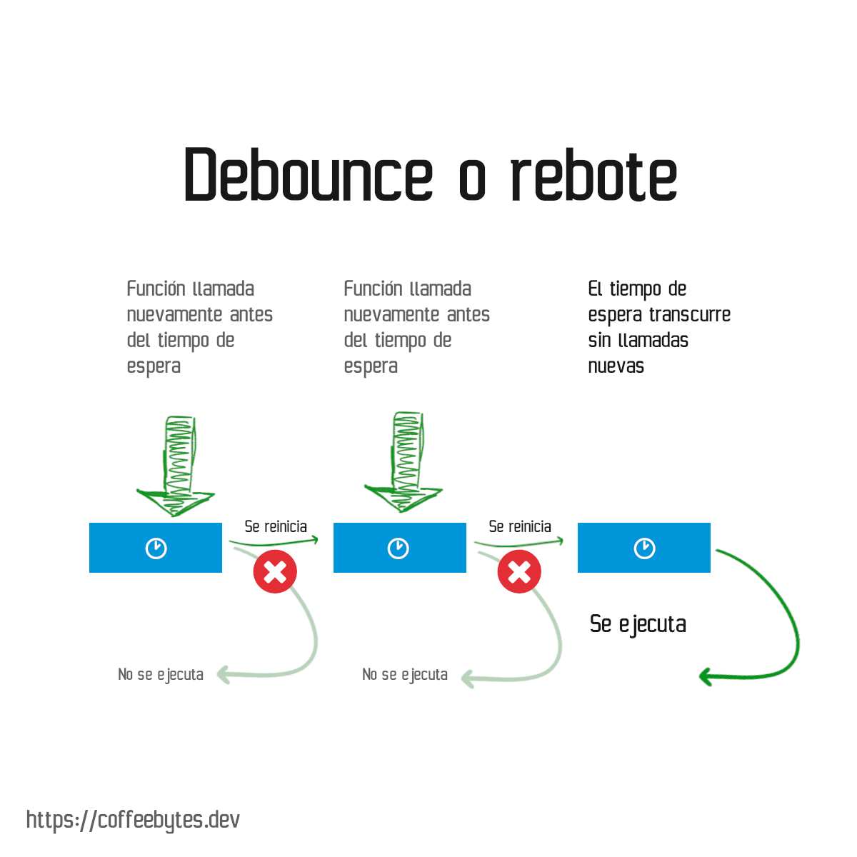 El patrón de rebote o debounce pospone la ejecución de una función hasta que transcurra un determinado tiempo de espera.