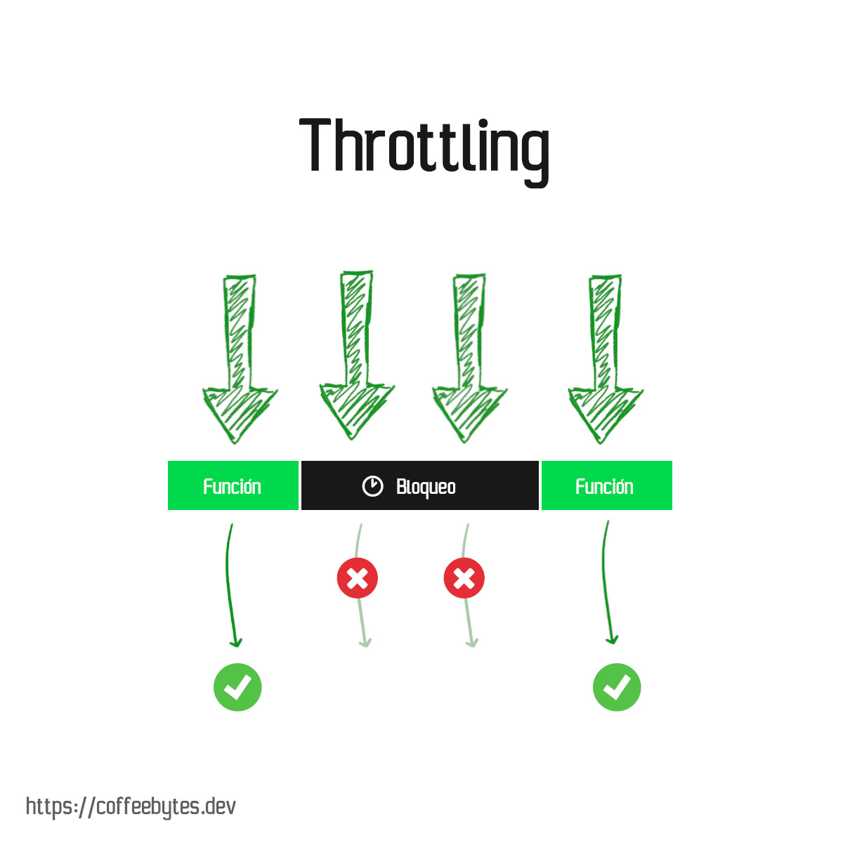 El patrón throttling (o aceleración) establece un tiempo de espera durante el cual no se pueden llamar nuevamente más funciones. A diferencia del patrón bounce, el tiempo de espera no se reinicia si intentamos llamar nuevamente a la función.